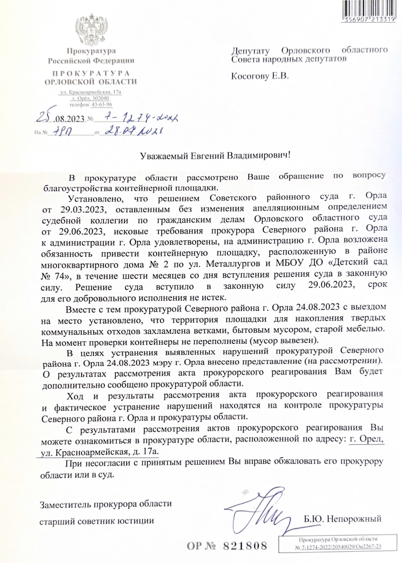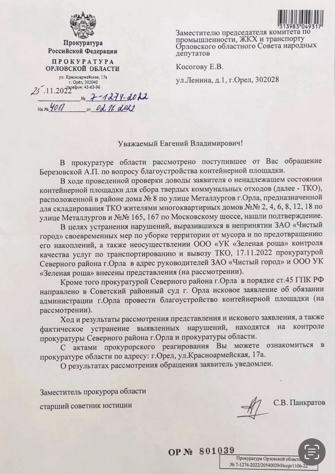 Строительство контейнерной площадки у д. 2 по ул. Металлургов и д/с №74 стало возможным только через суд. После того, как депутат СПРАВЕДЛИВОЙ РОССИИ в Орловском облсовете Евгений Косогов не оставил без внимания проблему жителей.