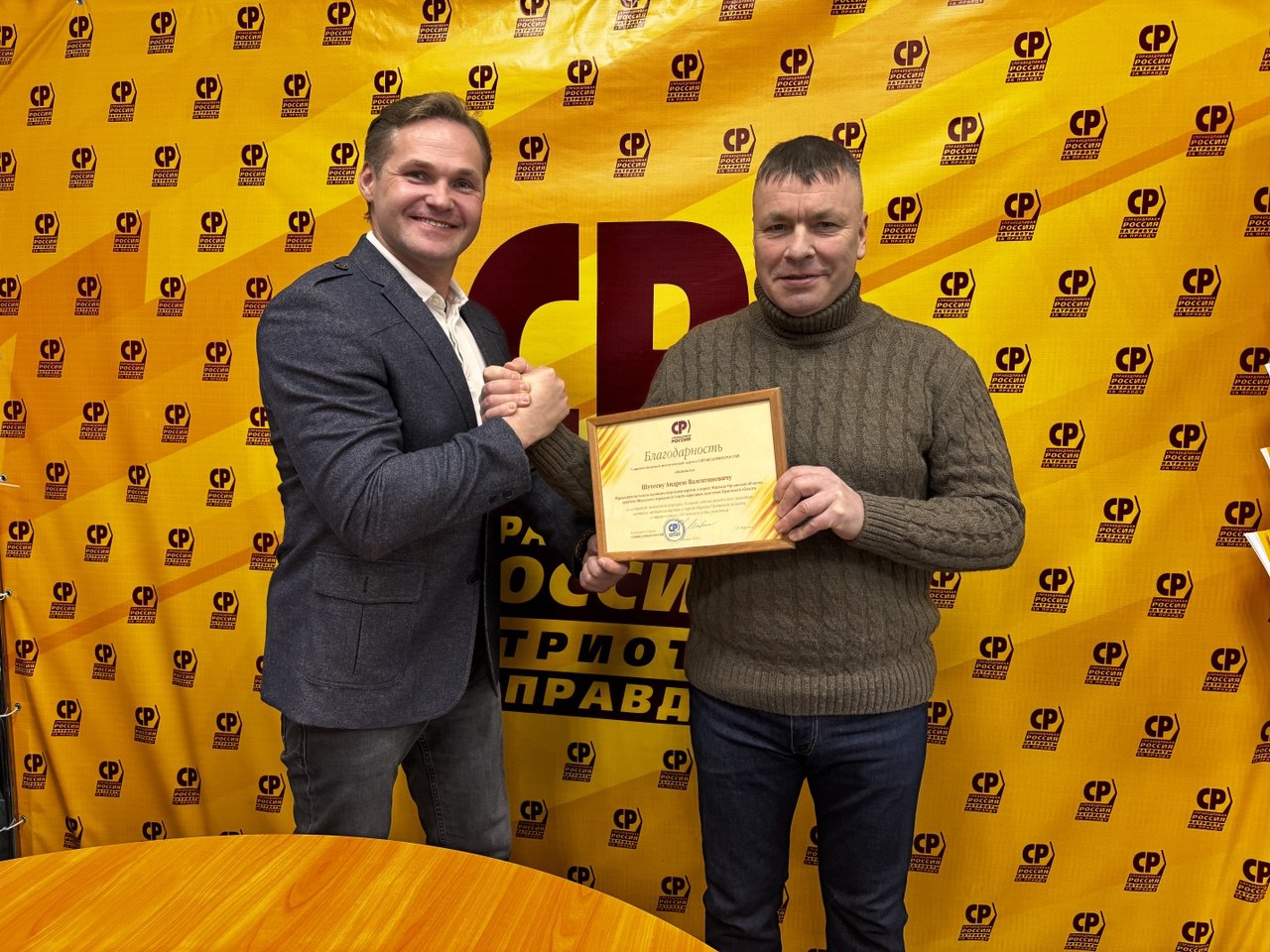 Председатель Регионального отделения партии СПРАВЕДЛИВАЯ РОССИЯ в Орловской области Руслан Перелыгин вручил благодарность от СПРАВЕДЛИВОЙ РОССИИ и от руководителя партии депутату Мценского горсовета, председателю Местного отделения партии во Мценске Андрею Шутееву в связи с юбилеем. Торжественное вручение состоялось в офисе партии в Орле.